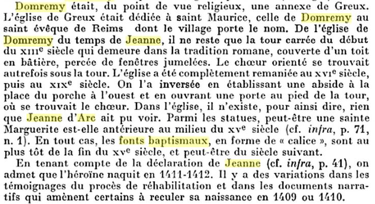 Car là, par un curieux raccourci de l'Histoire, cette église qui abrite une cuve baptismale qui " aurait " servi à baptiser Jeanne, est devenue ... l'église du baptême de la Pucelle… La supercherie apparait pourtant clairement dans l'énoncé du texte gravé dans le marbre situé au dessus de ces fonts baptismaux !
