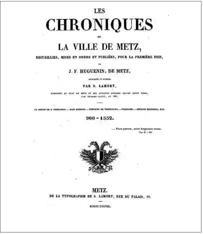 L’écrivain nancéen Charles Reichhart, auteur de l’Aperçu sur la Lorraine mystique, et historien de la Pucelle avec son ouvrage Histoire controversée de Jehanne dite d’Arc nous précise que « pour revenir sur les traces de Jehanne, il faut lire les Chroniques de la Ville de Metz recueillies, mises en ordre et publiées pour la première fois par J R Huguenin et éditées à Metz en 1838 ».