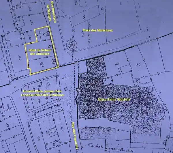 « Et puis s’en vint à ladite Arelont, et là fut faict le mariage de messire Robert des Hermoises, chevalier, et de ladite Jehanne la Pucelle ; et puis après s’en vint le dit siour des Hermoises avec sa femme la Pucelle demourer en Metz, en la maison ledit sire Robert, qu’il avoit devant saincte Segoleine ».
