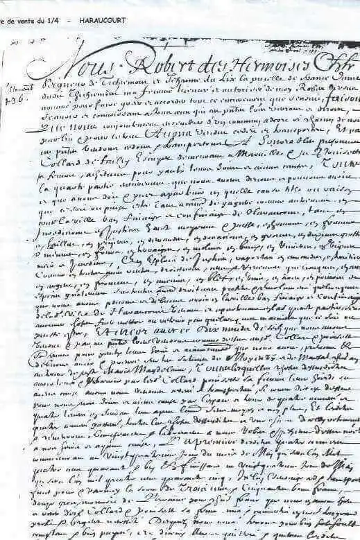 L’acte de vente du 07 novembre 1436 fournit fort heureusement des renseignements complémentaires. C’est la cession à Collard de Failly, écuyer demeurant à Marville, du quart de la seigneurie de Haraucourt et de dix muids de sel à Moyenvic et Marsal. L’acte est intitulé :