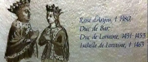 Cette petite illustration nous présente le fameux René d'Anjou, dont visiblement on ignore ici la date de naissance ! Mais par contre, on situe en 1463 la mort de sa première épouse, alors qu'après son veuvage survenu le 28 Février 1453, il a épousé en secondes noces Jeanne de Laval le 3 septembre 1454. On le fait Duc de lorraine à partir de 1431, quand bien même il était déjà duc consort de Lorraine depuis son mariage en 1420.