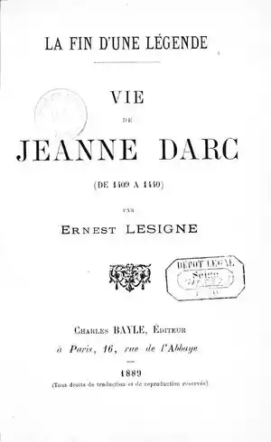Il est le premier auteur qui s’attaque aux légendes. En 1889 parait à Paris, chez Charles Bayle, " La Fin d’une Légende, Vie de Jeanne d’Arc (de 1409 à 1440) ". Lesigne est fonctionnaire de l’université et professe l’histoire, non sans rencontrer de nombreuses difficultés dans son enseignement. Refusant d'obtempérer et continuer à enseigner des légendes historiques, il est mis à pied par le ministre de l’instruction publique.