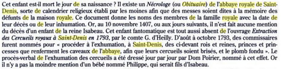 L'histoire officielle nous conte que le dernier né d'Isabeau fut un enfant prénommé Philippe, qui fut ondoyé, ne vécut que quelques heures, et fut ensuite enseveli à St Denis...