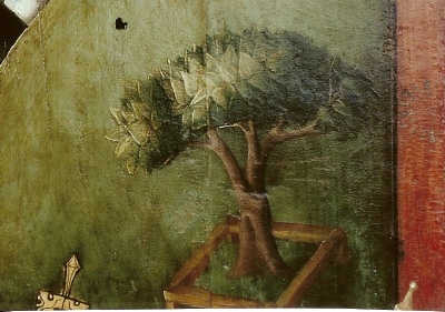 Celui qui se trouve plus à l’avant plan, est quant à lui épanoui et protégé par une barrière (nulle doute que celle-ci ait un sens symbolique, hermétique). J’y vois la fin du schisme de l’église catholique d’occident. (juillet 1415) Les deux racines se rejoignent enfin et l’arbre, à nouveau réuni va mieux.