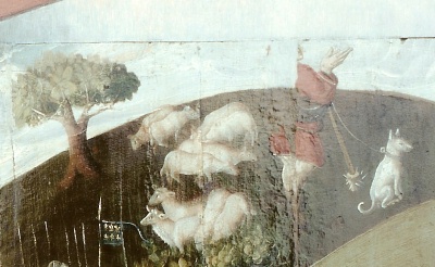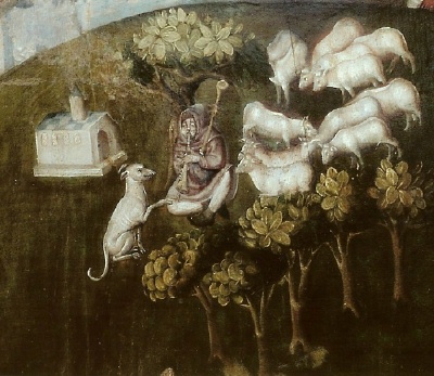 Là, il y a bien des moutons (plus près des vrais chrétiens que les bovidés du joueur de biniou, qui doit être le Pape d’Avignon), mais leur pasteur, s’il prie (il semble joindre les mains vers le ciel, mais la qualité du cliché rend la chose incertaine), leur tourne aussi le dos. Il est vêtu de rouge, couleur symbolique des grandes passions, haine et amour. Son chien à lui est tenu en laisse et porte un fort collier, ce qui dit son insoumission, mais aussi la férule qui lui est imposée. Il semble pourtant, oreilles dressées, scruter très attentivement l’horizon vers l’est, vers l’orient.