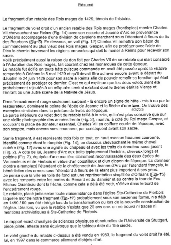 M. Walter Schott, le découvreur, s’est livré à une première analyse de l’œuvre, rédigée sous forme de rapport en 1998, transmis aussitôt au Centre Jeanne d’Arc d’Orléans.