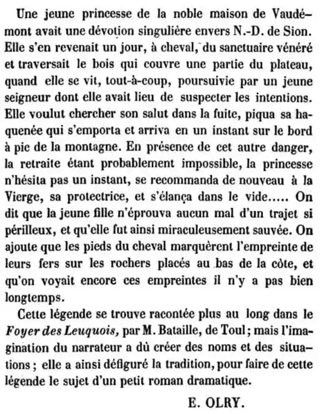 La tradition locale explique qu'une " Pucelle " (à cheval), poursuivie par un (ou plusieurs) cavalier(s) agressif(s), avait dû à sa parfaite maîtrise de l'équitation, d'échapper à son (ou ses) poursuivant(s) !