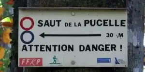 Le panneau indiquant l'endroit du "saut de la Pucelle", et une vue du chemin menant au ravin, protégé par une barrière
