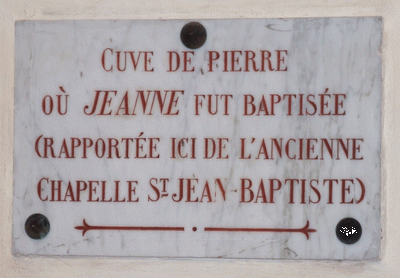 Car là, par un curieux raccourci de l'Histoire, cette église qui abrite une cuve baptismale qui " aurait " servi à baptiser Jeanne, est devenue ... l'église du baptême de la Pucelle… La supercherie apparait pourtant clairement dans l'énoncé du texte gravé dans le marbre situé au dessus de ces fonts baptismaux !