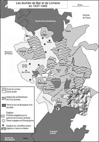 Sous René d'Anjou, les États lorrains vivent au rythme de la guerre, en marge du conflit franco-anglais de la guerre de Cent Ans, puis au cœur de l'affrontement entre le roi de France et le duc de Bourgogne.