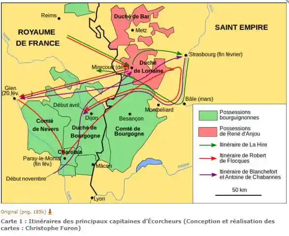 Le premier groupe d’Écorcheurs naît avec la reprise en 1438 de la guerre entre Antoine de Vaudémont et René d’Anjou, duc de Lorraine, alors en Italie et soutenu par Charles VII.