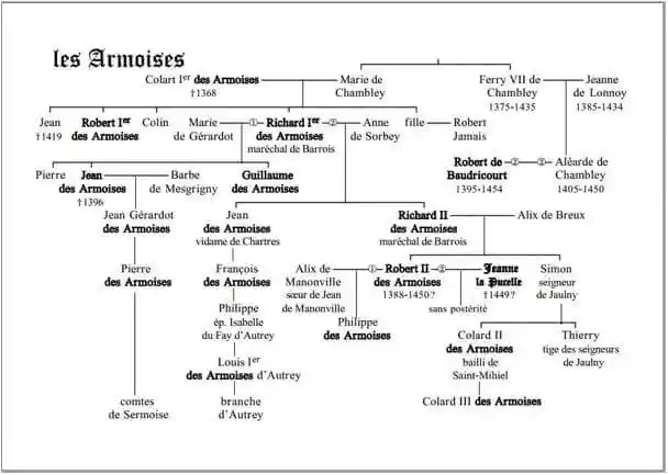 Robert des Armoises est le plus connu de cette famille car il a fait un mariage remarquable. Il épouse à Arlon en 1436 la Pucelle d’Orléans qui se fait appeler alors Jeanne du Lys, du nom de sa famille nourricière qui possède le titre de chevaliers d’Arc.