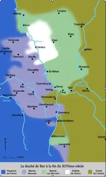 Jacques du Lys et la famille des chevaliers d’Arc sont des grands serviteurs de la Couronne. Jacques, qui est le quatrième fils de la famille du Lys, n’est pas le titulaire du titre de chevalier d’Arc, mais le prestige de sa famille et son autorité personnelle lui permettent d’accéder à une fonction de confiance auprès de la très puissante Yolande d’Anjou, duchesse de Bar. Il est son régisseur et, à ce titre, contrôle les immenses domaines Barrois de la duchesse ( la carte du duché de Bar ci-dessous montre l’étendue du domaine d’activité de Jacques du Lys au service de la duchesse ).