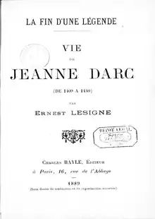 Ernest Lesigne, de la première génération des historiens contestataires de l’histoire « officielle », situe l’année de naissance de la Pucelle au commencement de l’année 1410, peut-être 1409. Nous pardonnons à Lesigne, car ce dernier n’avait pas encore découvert que Jeanne était une princesse royale et, n’avait pas en conséquence, étudié sa date de naissance avec toutes les informations que nous avons aujourd’hui.