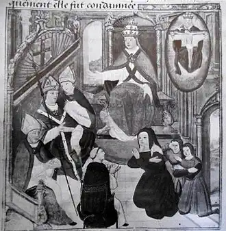 « Le roi Louis XI succédant à son père, très affecté qu'une si indigne mort eût été infligée à une vierge si magnanime, obtint, dit-on, du pontife romain Pie II, que deux jurisconsultes fussent envoyés en France pour revoir soigneusement la cause, et informer sur la vie de la victime. Dès leur arrivée, ils citèrent deux faux conseillers, et des juges qui vivaient encore. La cause soigneusement examinée, il leur fut manifeste que l'on avait condamné une femme très innocente ; que tout ce qu'on lui avait imputé était controuvé, notamment les inculpations de maléfice et de magie ; bien plus, que toute sa vie était en parfait accord avec ses grands exploits, et qu'elle n'avait jamais rien fait dont la religion pût être offensée. C'est pourquoi on infligea aux deux accusés le supplice que longtemps avant ils avaient sentencié contre la très innocente vierge. On ordonna que les ossements de deux autres juges tirés du sépulcre seraient livrés aux flammes, en ce qu'il fut ordonné qu'on bâtirait une église, à la place où cette courageuse vierge avait été brûlée. Du reste des biens des condamnés confisqués et vendus, une messe quotidienne fut fondée à l'honneur de Dieu, et pour l'âme de la défunte. »