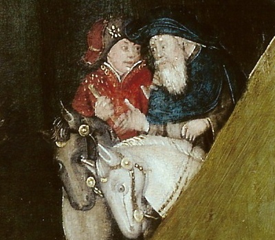 On retrouve notre personnage en rouge, le Pape guerrier, Grégoire XII. Il porte de riches vêtements. Il tient à la main un bâton de commandement qu’il remet à l’autre cavalier, à la tignasse et à la barbe blanche.