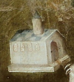 Par contre, le petit bâtiment représentant une sorte de chapelle munie d'un clocher, et couverte de tuiles de couleurs évoque plusieurs hypothèses pour nous, surtout à cause du flot de liquide (du sang?) qui semble s'écouler par sa porte !