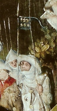 Pas de doutes possibles, il s’agit de soldats et à part l’homme en rouge et son accompagnateur portant turban ( ?) avec qui il s’entretient, ils tous portent le harnois blanc. On peut donc dire qu’il s’agit plutôt de chevaliers, de seigneurs. L’homme en rouge porte un vêtement de tissu. Il n’est pas militaire, ou alors seulement occasionnellement. Il arbore néanmoins fièrement sur la tête une salade nantie d’un imposant plumet. Dans les codes militaires de l’époque ceci le désigne comme étant le chef, l’officier dirigeant cette troupe.