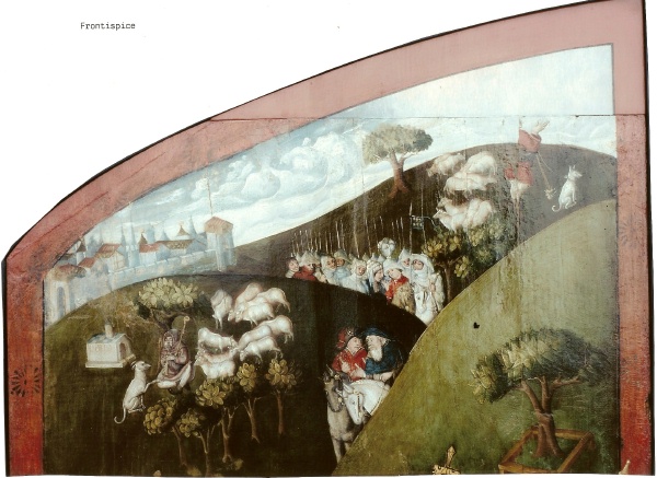 Ce retable a malheureusement (et très curieusement ?) été débité en plusieurs morceaux et vendu aux enchères, ce qui fait que les diverses photos que nous mettons en ligne sont de qualité inégale. La société de vente aux enchères décrit en 1997 une des parties de l’œuvre (la partie haute, vue ci-dessous) ainsi : maître du sud de la France, autour de 1420, paysage avec bergers et une troupe de soldats, huile sur bois (parqueté),de 49,5cm par 87cm,