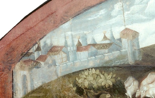 La ville fortifiée dans le coin haut gauche nous semble être Jérusalem, du fait de la présence de "bulbes" dorés sur certaines toitures ; Orléans est d’habitude représentée au-delà de la Loire, et à plat, alors qu’ici, on peut s’apercevoir du relief de ce paysage.