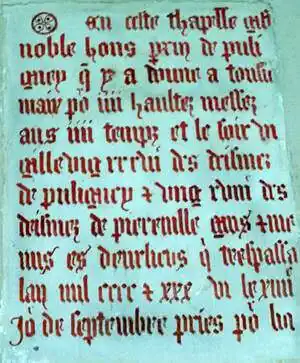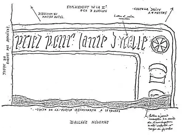 Après deux heures d'efforts, une marche est descellée. Nettoyé de son ciment, un angle de la tombe apparaît peu à peu, portant des inscriptions gothiques que nous identifions. L'allure des caractères et du fragment de texte indiquent le XVe siècle. Nous contemplons, par conséquent, l'une des plus vieilles sépultures de l'église. Quelques mots à demi effacés suivis d'un signe, nous suffisent pour comprendre " :
