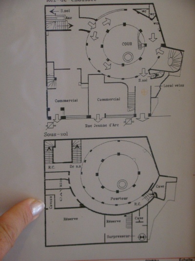 Ci-dessus, le plan de l'immeuble du 102 rue Jeanne d'Arc, où on distingue bien la courette circulaire marquant l'emprise de l'ancienne tour! le petit cercle figure l'emplacement du puits qui permit l'évasion.