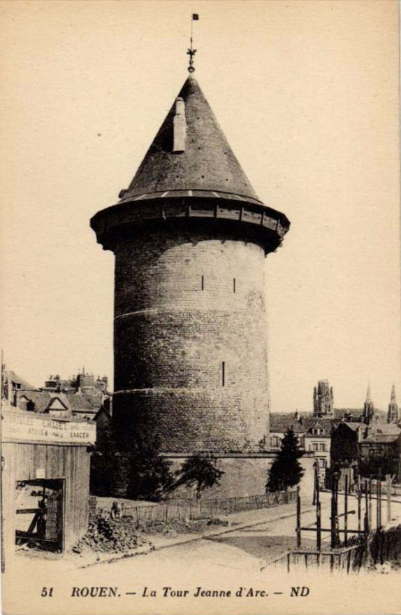 La vraie tour " Jeanne d'Arc " a été détruite à la fin du XVIe siècle. Elle faisait autrefois partie du Château de Bouvreuil, lieu de détention de Jeanne à Rouen. En 1908, la construction d'un immeuble au 102 ( de la Rue Jeanne-d'Arc actuelle ) mit au jour la partie inférieure de la tour. Près de douze mètres de maçonnerie ont été conservés. Un puits occupe une partie du sol de la courette ainsi créée et seule sa margelle ( reconstituée ) reste encore visible.